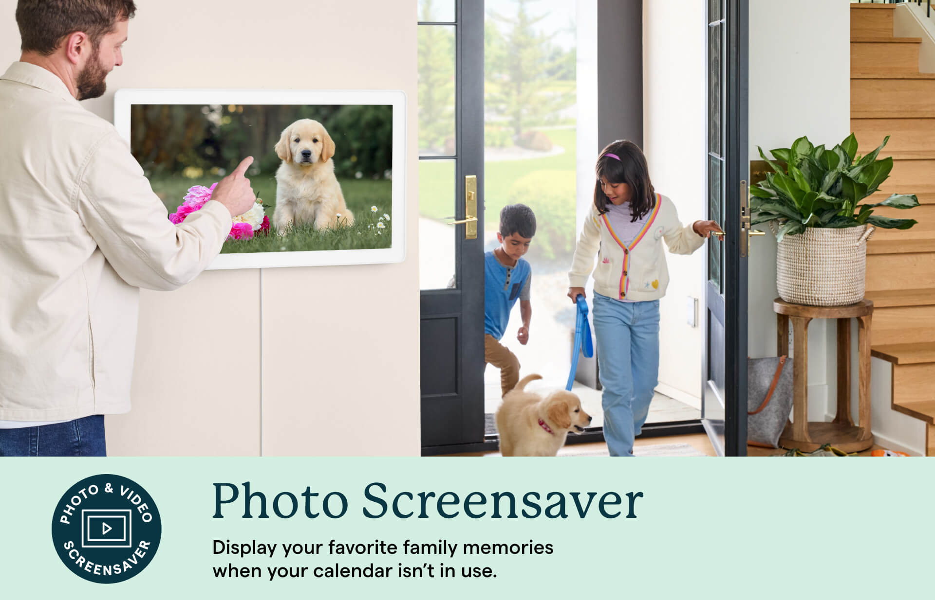 Man setting a family photo screensaver on the Skylight 27-inch wall-mounted digital calendar while kids enter with their dog.