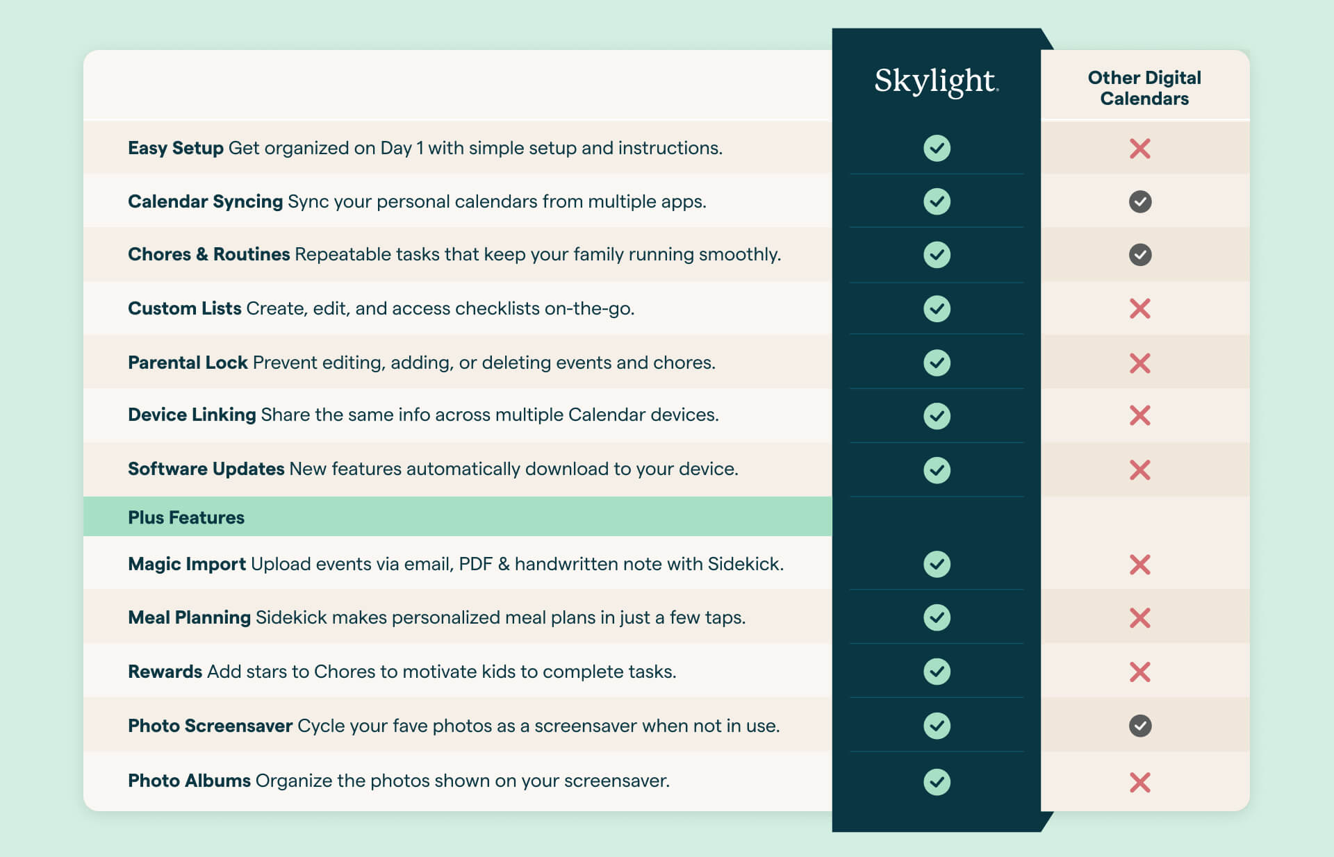 Comparison chart showing Skylight Calendar features like easy setup, calendar syncing, chores, custom lists, parental lock, device linking, software updates, meal planning, rewards, and photo screensaver compared to other digital calendars.